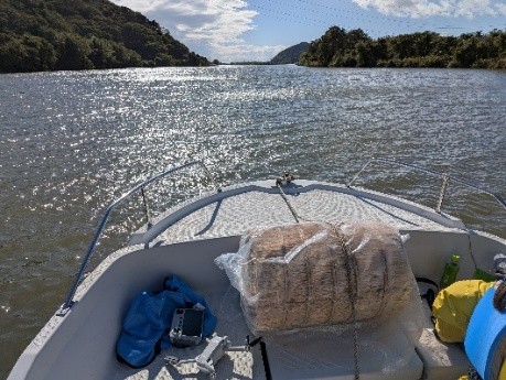 水門を超え新堀方面から七北田川対岸に舟は向かいます。