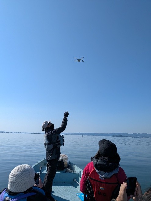 上の写真はドローン空撮家の熊谷会員が鏡のような松島湾でドローンを飛ばした時のものです。出来上がりが楽しみです。