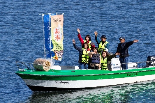 コメ俵は乗船した本宮理事から陸上の武田会長に手渡され多賀城の貞山公園に陸揚げされました。