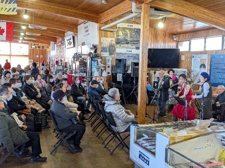 会場となったゆりあげ港朝市メイプル館には当日三々五々人々が集まりやがて始まると聴衆はリズムをとりながらって聴いている人もいました。